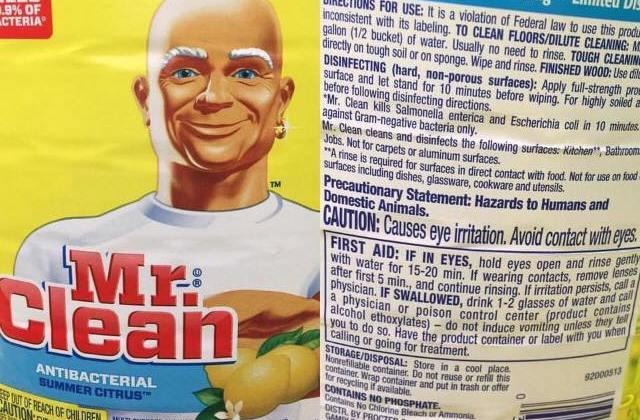 Have you noticed fine print that reads: “Precautionary statement: Hazards to humans and domestic animals” (as shown on this Mr. Clean label)?