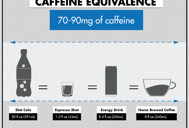 - An 8.4-oz. energy drink, a 20-oz. diet cola, and a shot of espresso, all sources of caffeine, contain about the same amount as a cup of coffee (80 mg). Other recognizable choices include: