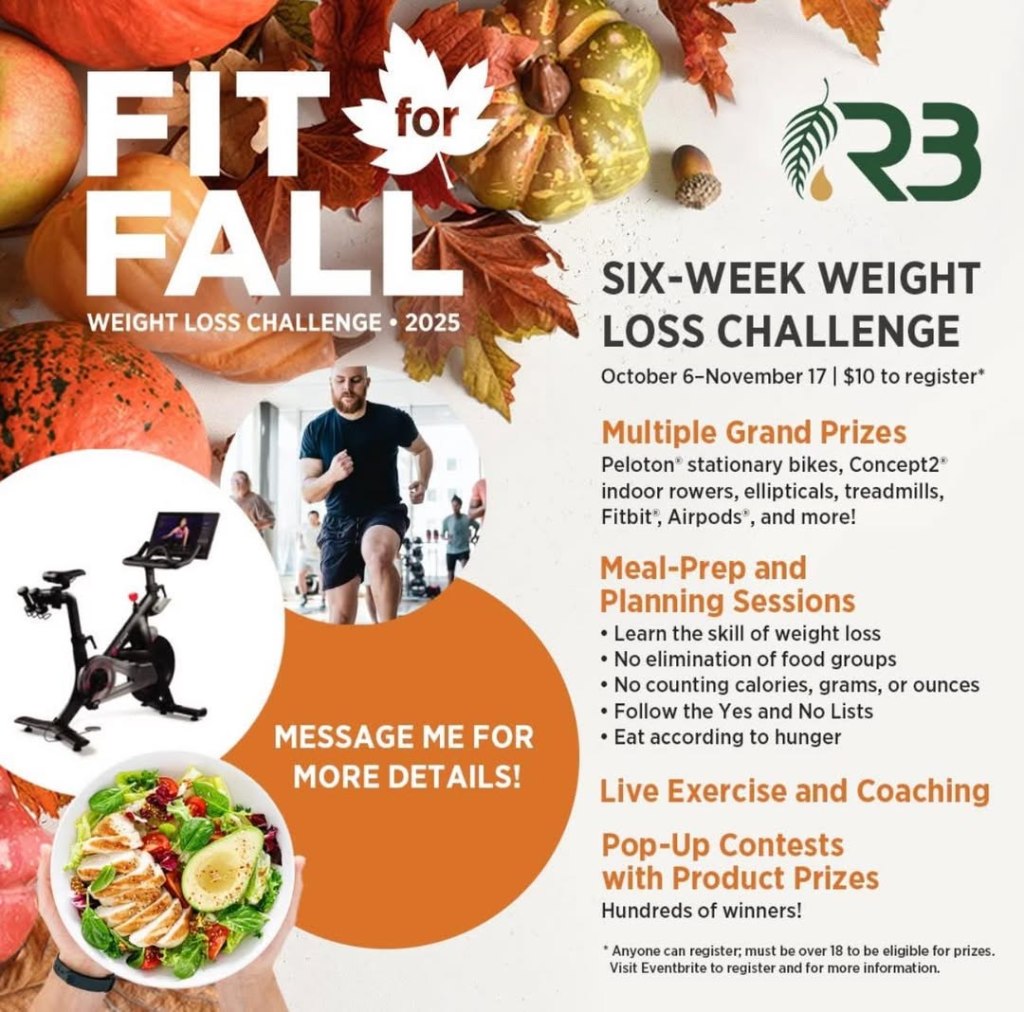Join us for the R3 Fit for Fall Challenge, starting on October 6! This is not just another diet; it’s a sustainable lifestyle change designed to help you enjoy your favorite foods while improving your wellness.