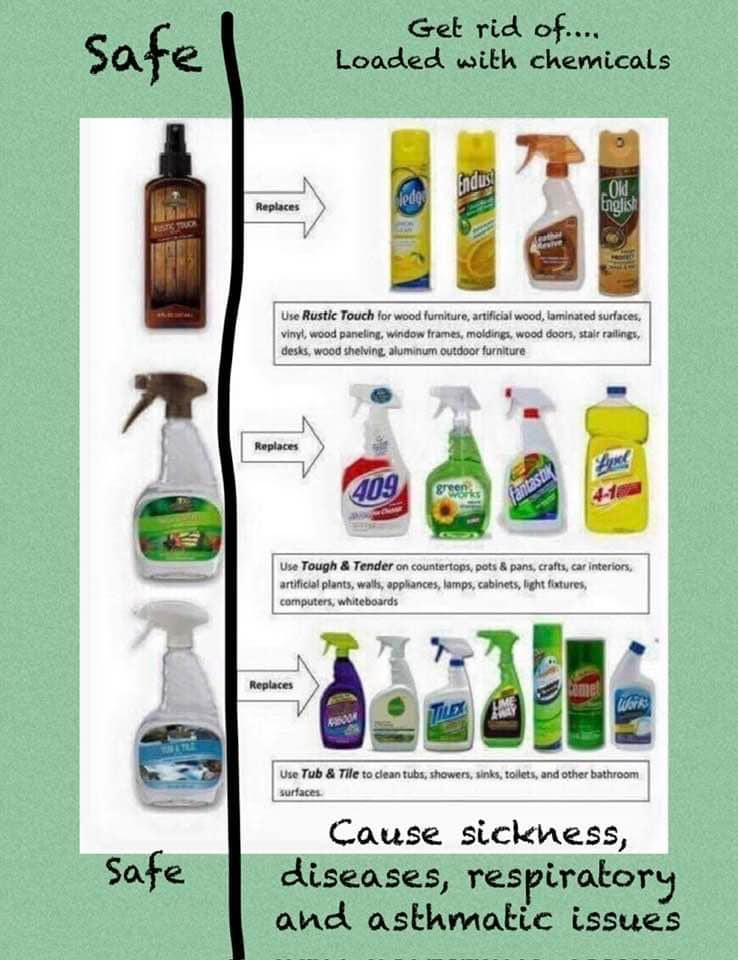 When you make the change, cleaning feels better—the rashes and eczema I had went away; the environment seems fresher—no chemical or fake flowery smells; and you find your family’s health, hair and skin has started to clear up! All because you changed cleaning and other household products.
