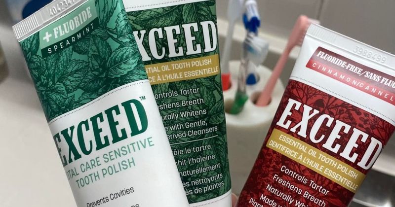 Then I found this tooth polish called Exceed. I found this tube of tooth polish through the Wellness Company 19 years ago. It has natural ingredients like xylitol, T40-C3® Melaleuca Oil (tea tree oil), coconut-based cleaners, and potassium. Not only is it great on plaque and tarter, it is also naturally whitening.